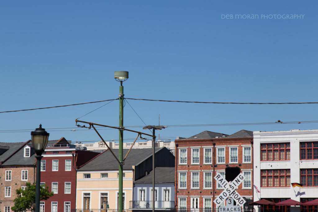 Buildings in a row across from the steamboat dock. In the foreground is a railroad crossing, tracks, and cable car cables.
