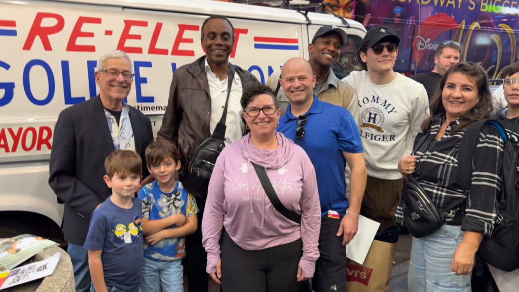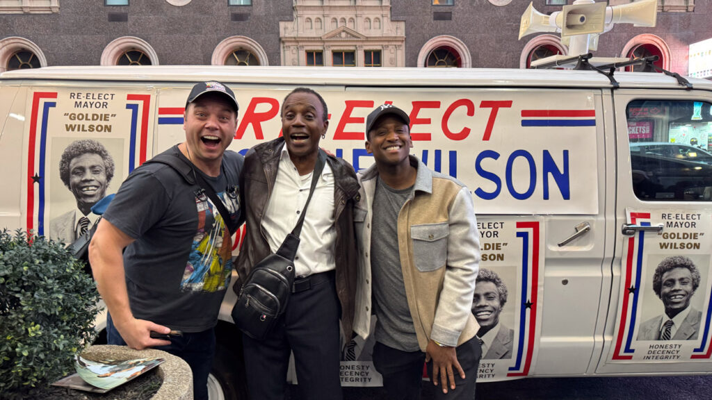 We all filed out of the theater, and just outside was a replica of the Reelect Mayor Goldie Wilson van – speakers and all!