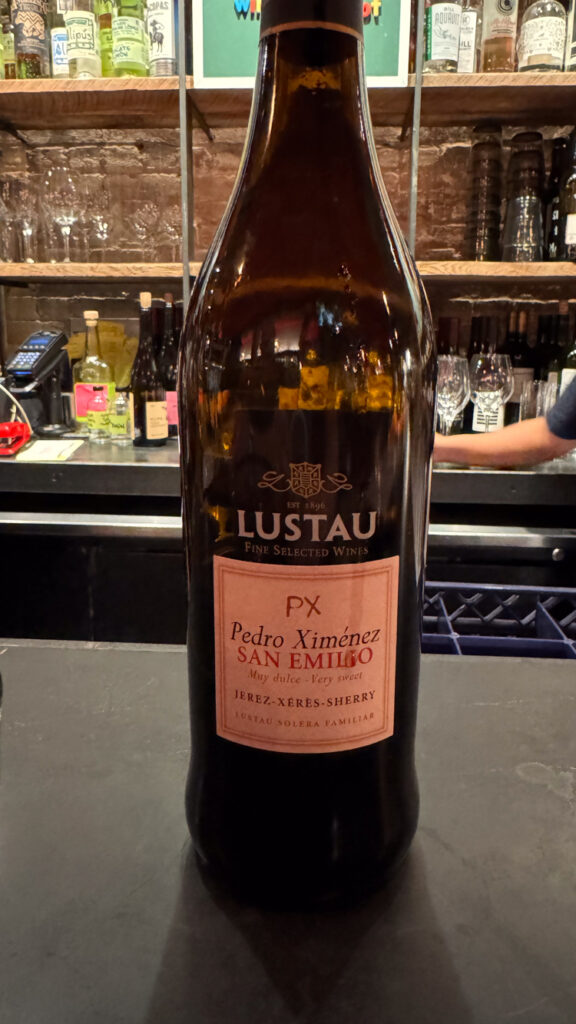 Though sweet wine is not usually my thing, I decided to try a dessert wine. The bartender thought for a moment, and then asked, “Something raisin-y?” I said, “Sure!” Nailed it! This Emilio Lustau Solera Reerva ME Moscatel Emilin Muy Dulce Jerez-Xeres-Sherry Muscat was like drinking a box of Sunmaid rasins and it was delicious!