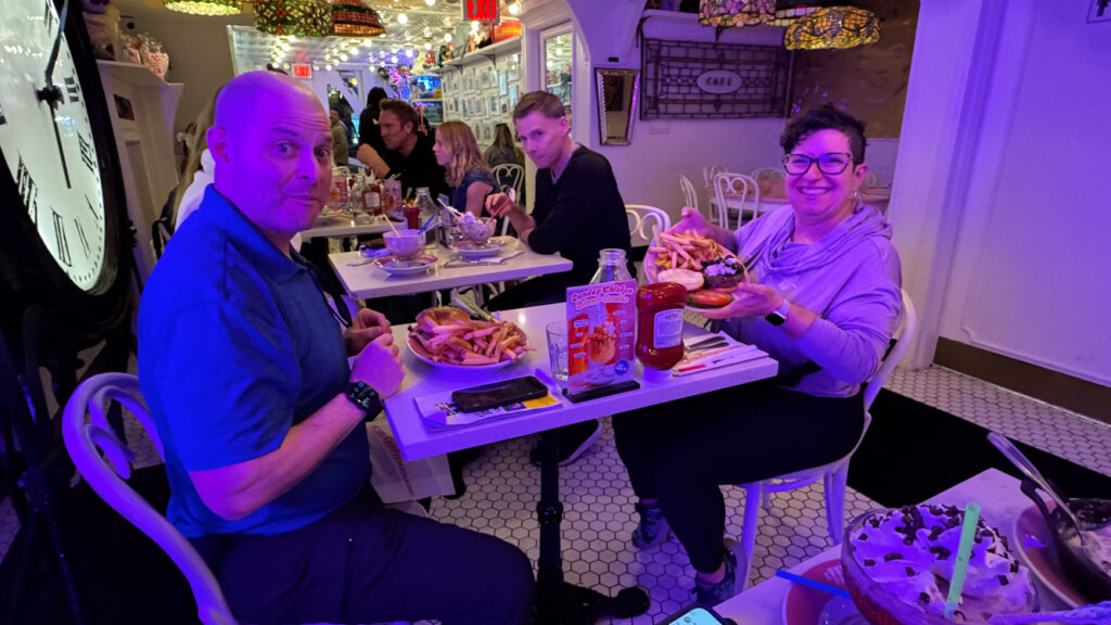 We had not eaten solid food since our bagels at 11:30, so we were for sure ready to get some dinner. We headed up and east to Serendipity 3, and I got the Infamous Truffle Burger – the one that I once told TG I’d leave their father to marry. When my plate arrived, I looked at it lovingly, and said, “Oh, how I’ve missed you!” As I struggled to find an angle to capture the beautiful dish, the man next to us kindly offered to take a pic of the both of us. BJ said he was only going to have a bite of the frozen hot chocolate, so I had to make it extra enticing. I knew he couldn’t resist the peanut butter & chocolate version. Yeah, he ate about half. LOL.