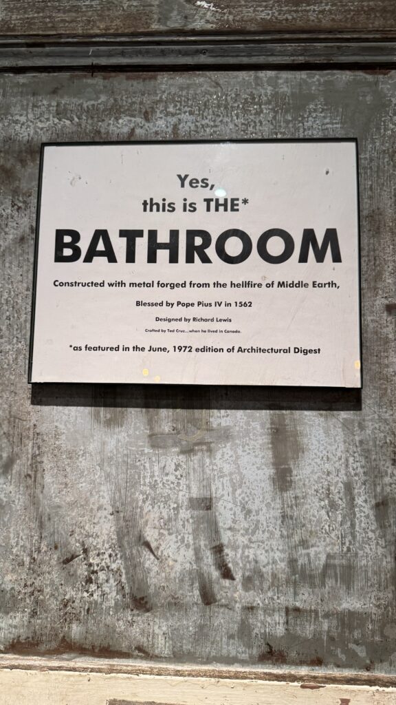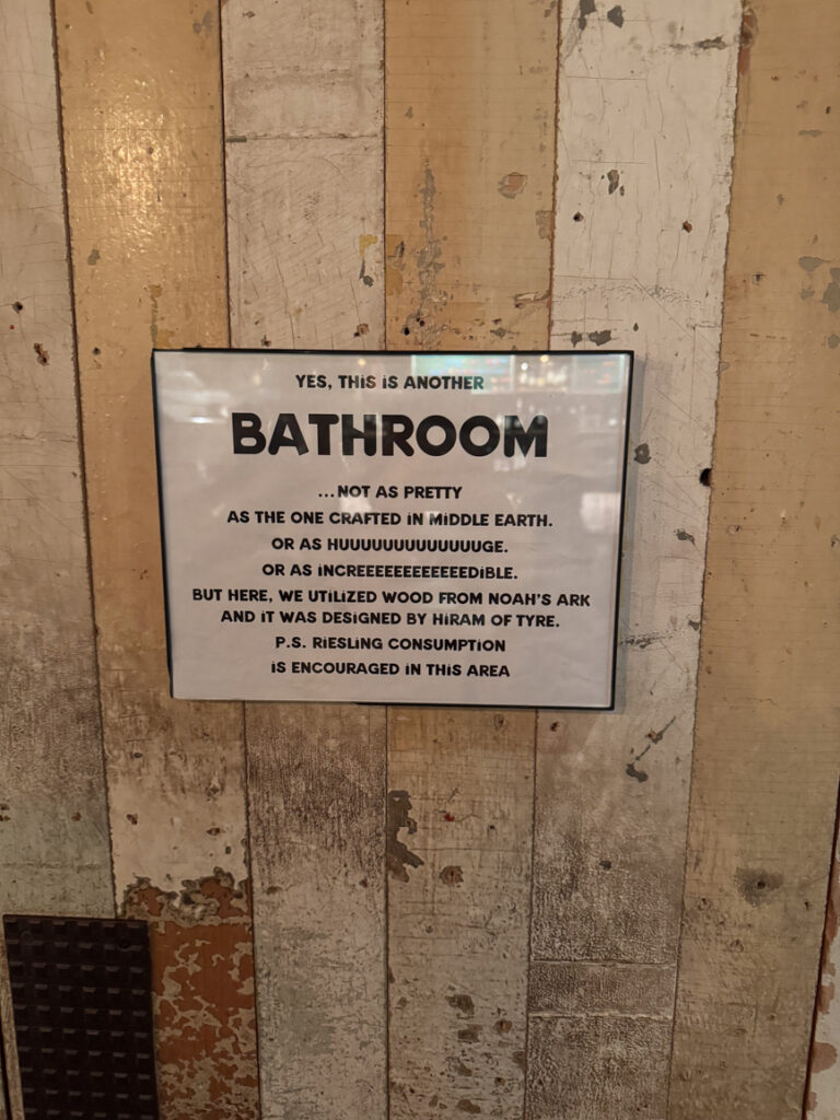 After that first glass, I told our bartender that I was in the mood for something akin to a tart NZ Sauvignon Blanc. The most fun part about this place was that they’d pour you a splash of anything just to try it. If it was to your liking, you could then order a half pour or a full pour. I had three splashes before landing on one I liked. And then I had to make a stop in the ladies. The first option was occupied, but I made a point to snap the sign before finding the other.