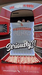 Right across from the gate was a contraption out of The Price is Right… Passenger Plinko sponsored by American’s Advantage Card. Not knowing yet how much time I had, I figured I’d get in line to play. I could always bolt if needed. I had a nice time chatting with the two people behind me, and before I knew it, I was up with little time to spare. Potential prizes included earbuds, a sound machine, a travel bag (AA branded toiletry bag), free on-board wi-fi, and a tablet computer. Obviously, the tablet was the top prize, and you know it’s impossible to get, right?