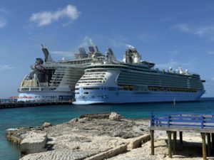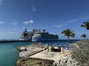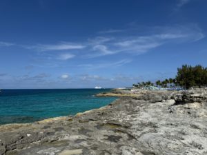 TG and I were going to recruit Hubs to snorkel with us, but first I had to use the loo. When I returned to the chairs, Hubs and TG were gone. I figured they went to snorkel and I’d go find them. I was snapping the breathing tube of my mask into place when my phone rang. It was TG on the other end. This is where the day became a bummer… TG told me that just a few minutes after we got out of the water, a 60-70 year old man washed ashore – RIGHT WHERE WE HAD BEEN. I felt positively sick to my stomach and had to sit down. His poor family! I must give props to all of the first responders who ran to the scene, administered CPR and located the man’s wife. As they carted him away on a beach buggy, they continued to do CPR as they drove out of sight. We never heard a helicopter (to take him to an ER), so I’m guessing they were not able to revive him. We don’t’ know if he was snorkeling, swimming, or what, or if he was from our ship or Freedom of the Seas as both were at the island that day. Regardless of how it happened, it was so awful and sad.